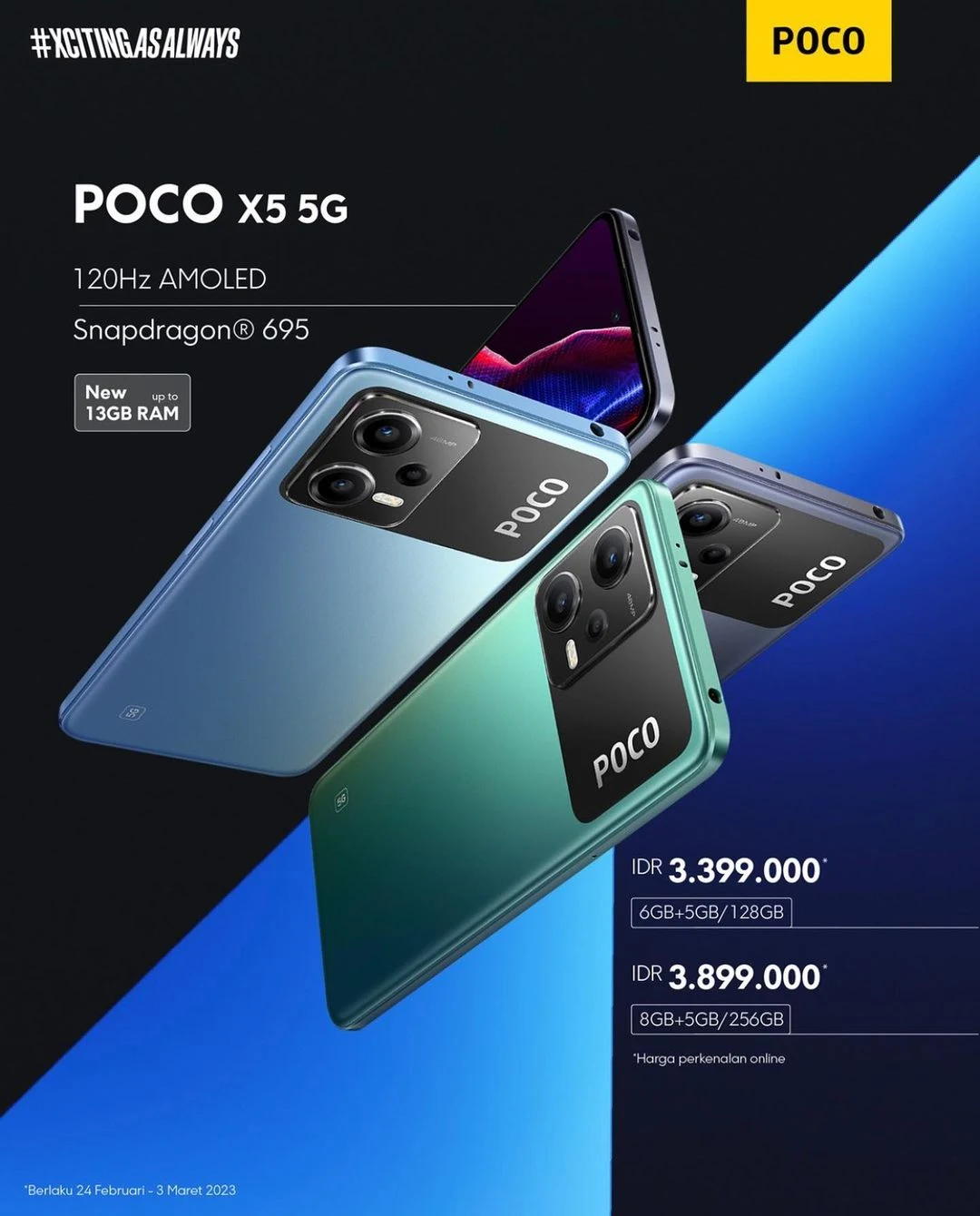 POCO X5 hadir dengan harga yang ramah di kantong. Varian 6GB/128GB dijual sekitar Rp 2,8 Jutaan, sedangkan varian 8GB/256GB dihargai sekitar Rp 3 Jutaan. Keren, nggak tuh?.