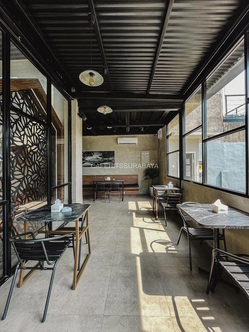 Coffee shop kekinian di Surabaya ini memiliki luas lahan dengan dua pilihan area, yaitu indoor dan semi outdoor. Area indoor tempat nongkrong estetik di Surabaya ini sangat nyaman untuk bekerja ataupun tempat kumpul-kumpul.