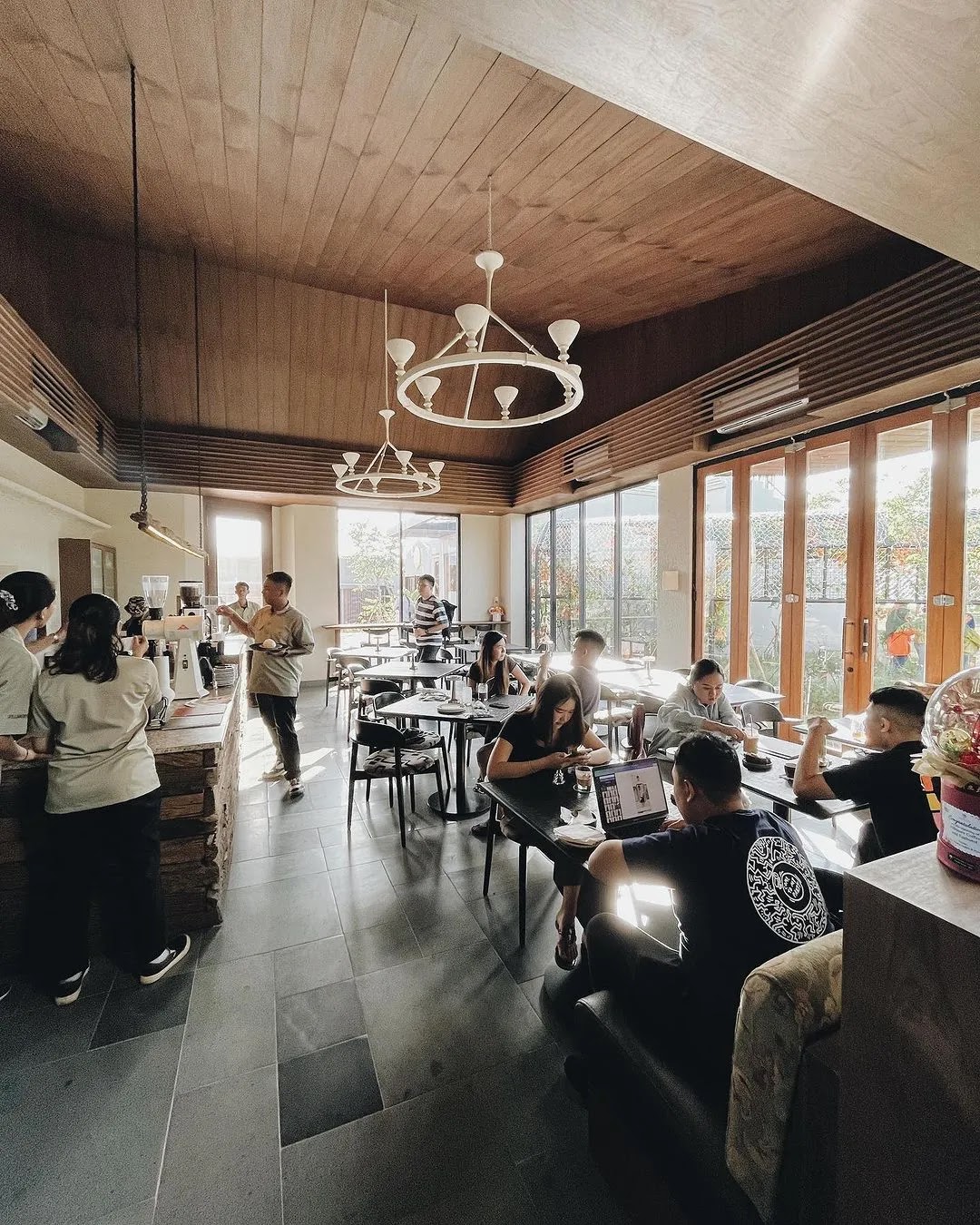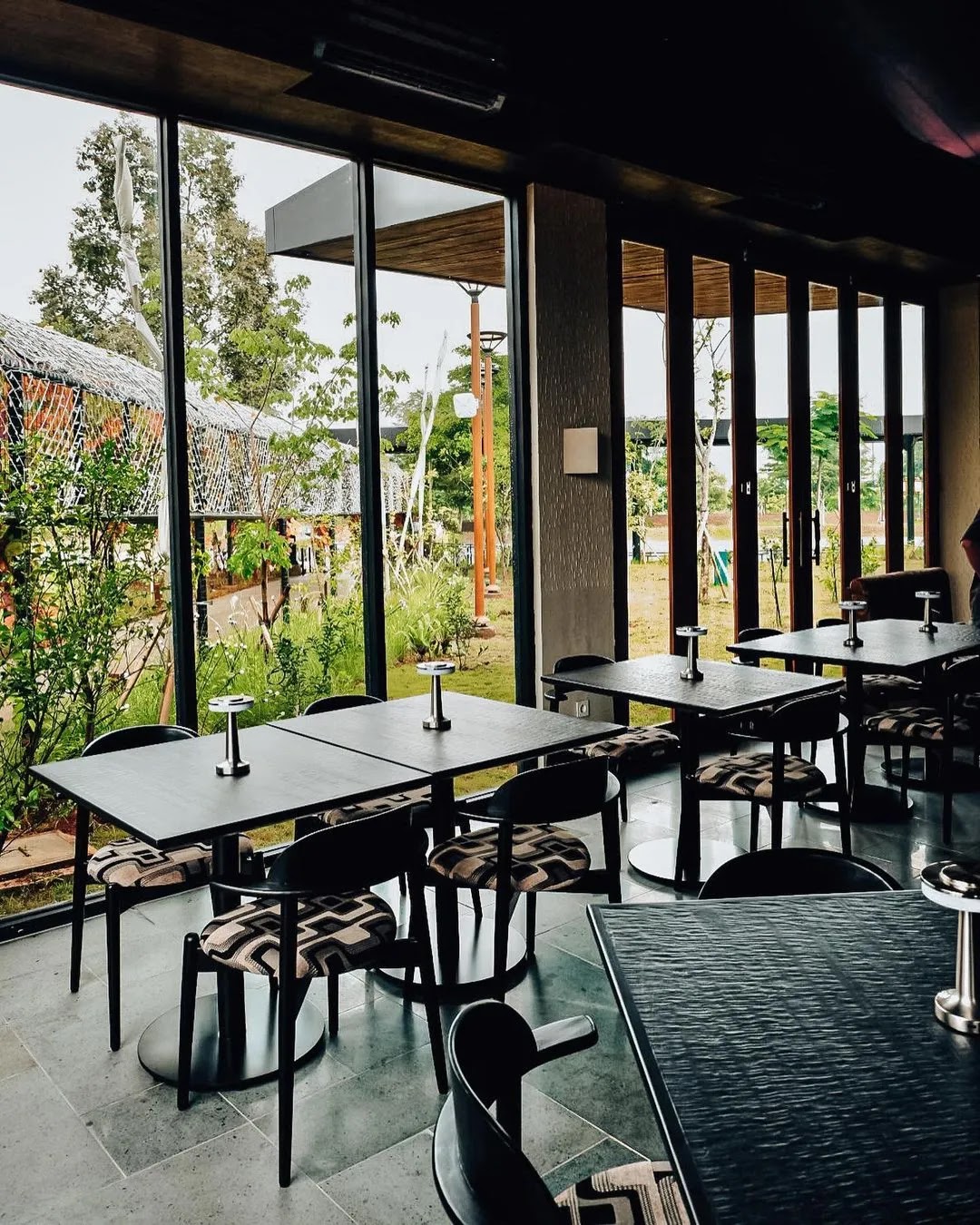Suasana semi outdoor tempat nongkrong estetik di Tangerang ini dipenuhi tumbuhan yang menambah kesan asri dan adem, menciptakan lingkungan yang cocok untuk nongkrong santai.