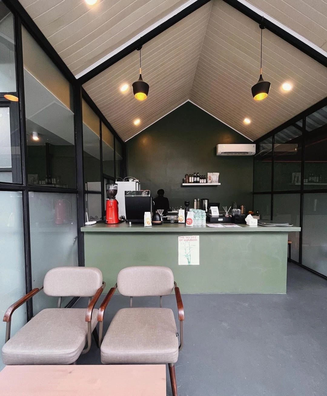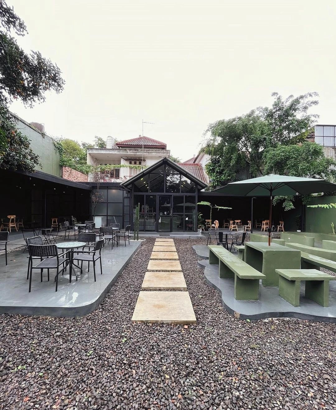 Desain bangunan coffee shop hits di Bogor yang minimalis modern dengan dominasi warna hijau memberikan nuansa kekinian dan instagenic di setiap sudutnya.