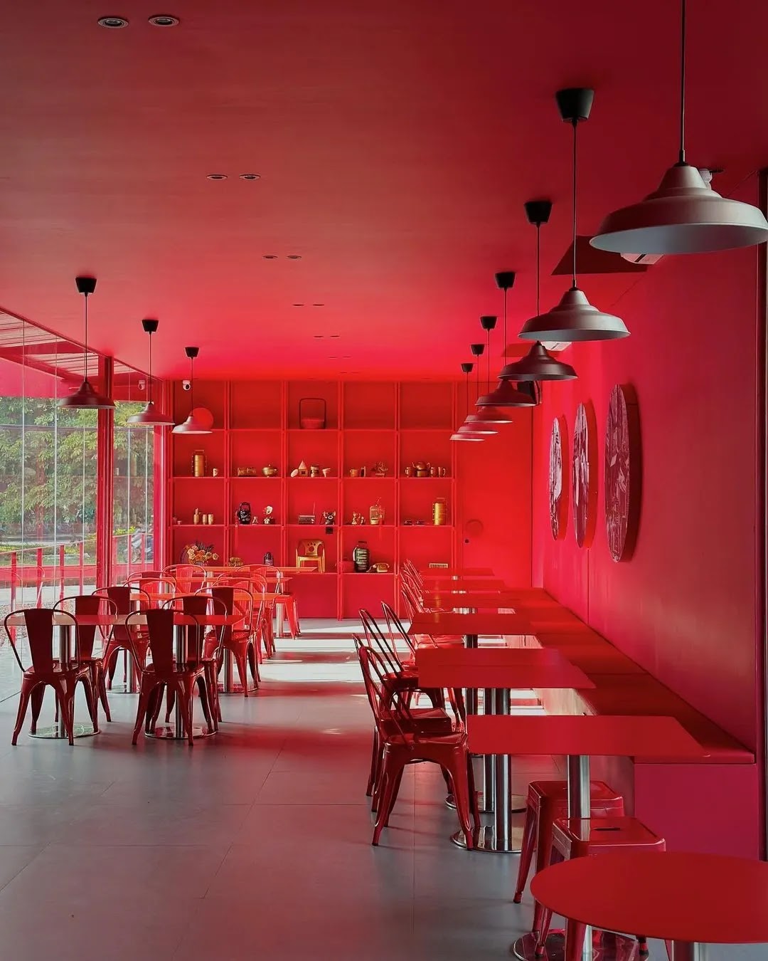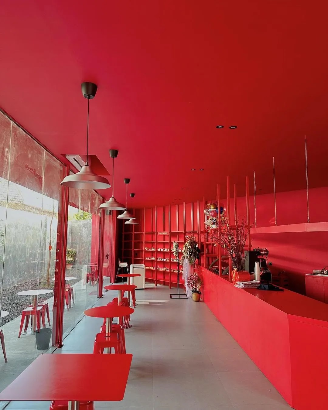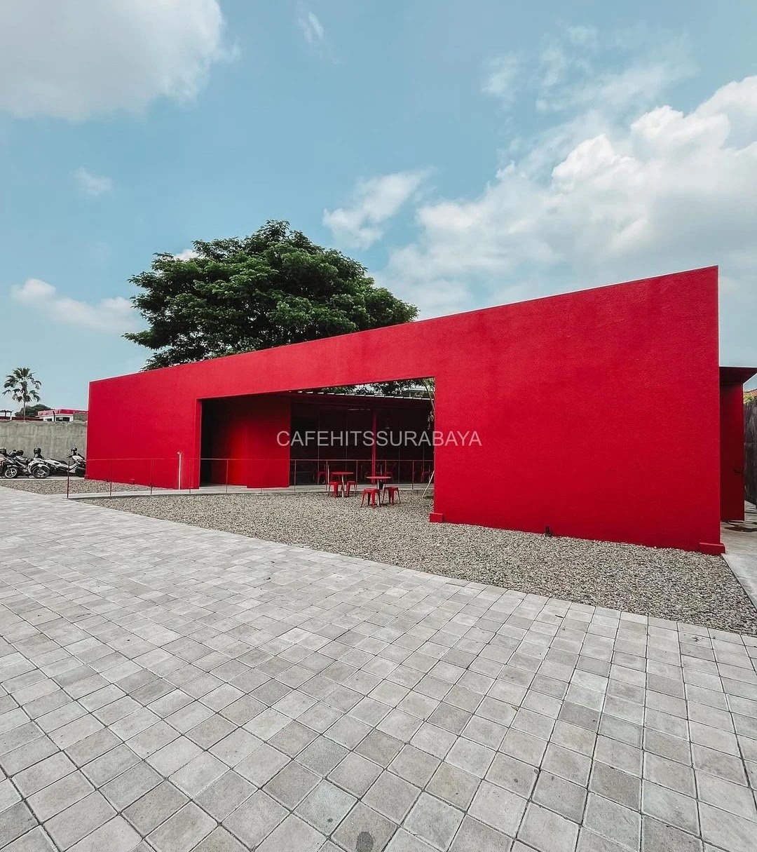 Desain bangunan tempat nongkrong hits di Surabaya ini mengusung konsep minimalis modern dengan dominasi warna merah yang menciptakan suasana yang kekinian dan instagramable.