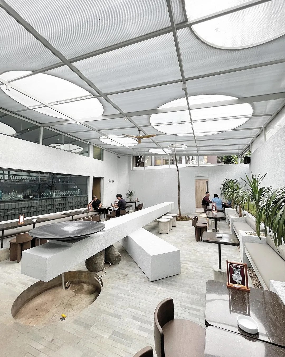 Area semi-outdoor tempat nongkrong kekinian di Jakarta ini dilengkapi dengan tata letak yang rapi, hiasan tumbuhan, dan suasana yang asri, menciptakan tempat yang nyaman untuk nongkrong.