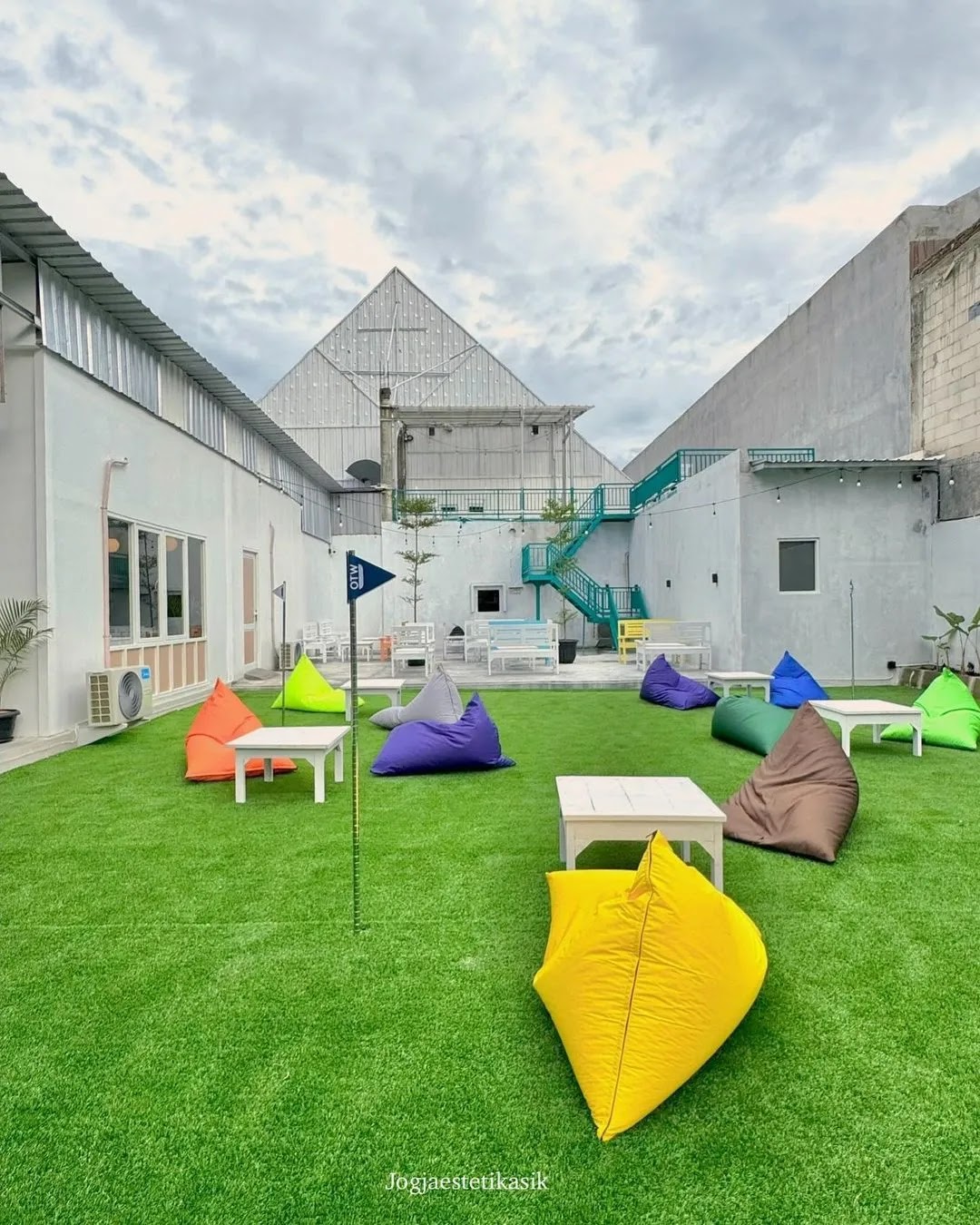 Sementara area outdoor tempat nongkrong di Jogja yang hits ini menawarkan pengalaman bersantai dengan seating area bean bag dan kursi yang tertata rapi.