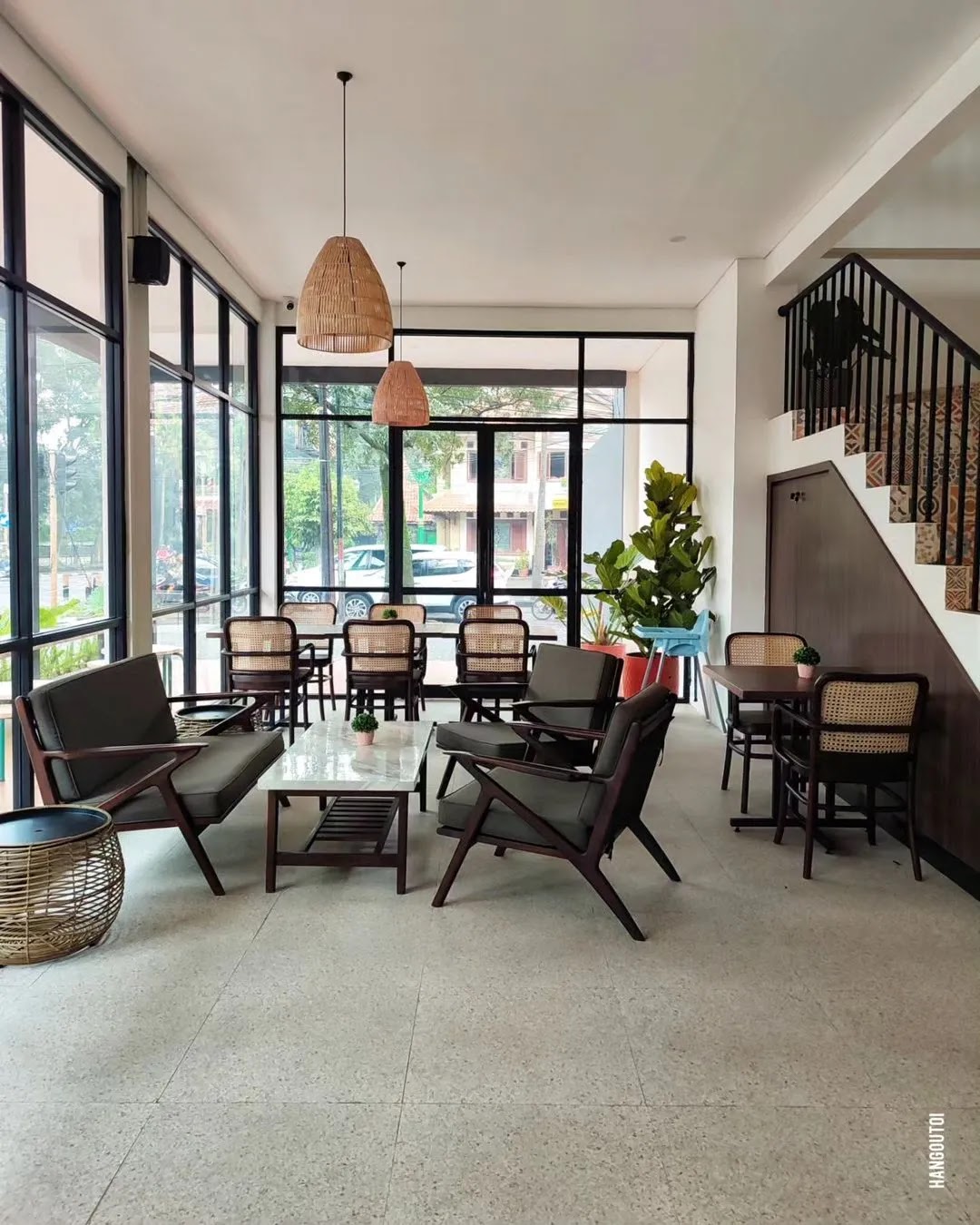 Area indoor dan semi-outdoor tempat nongkrong estetik di Bandung ini berada di lantai atas dan bawah, memberikan kenyamanan untuk tempat bekerja atau bersantai.