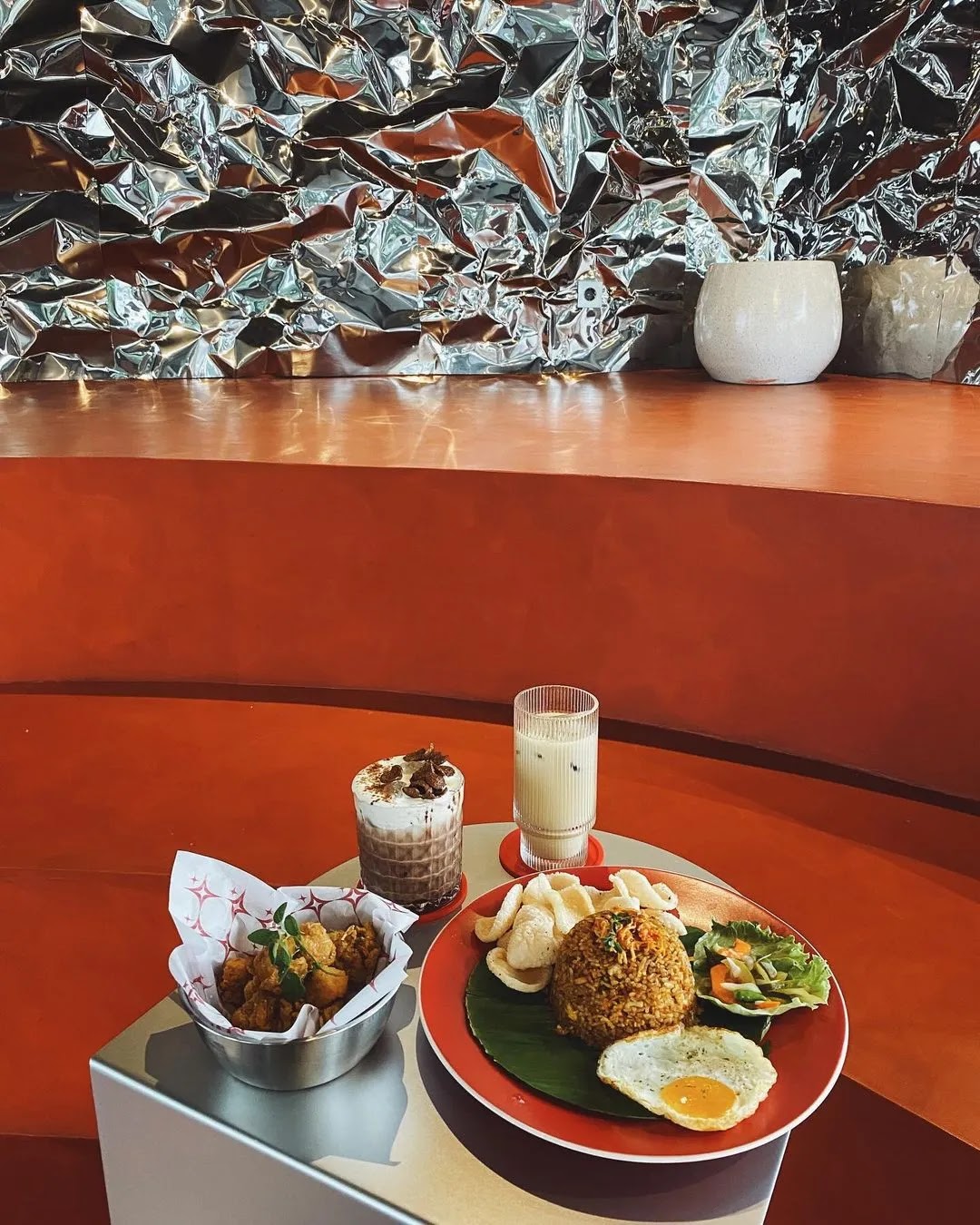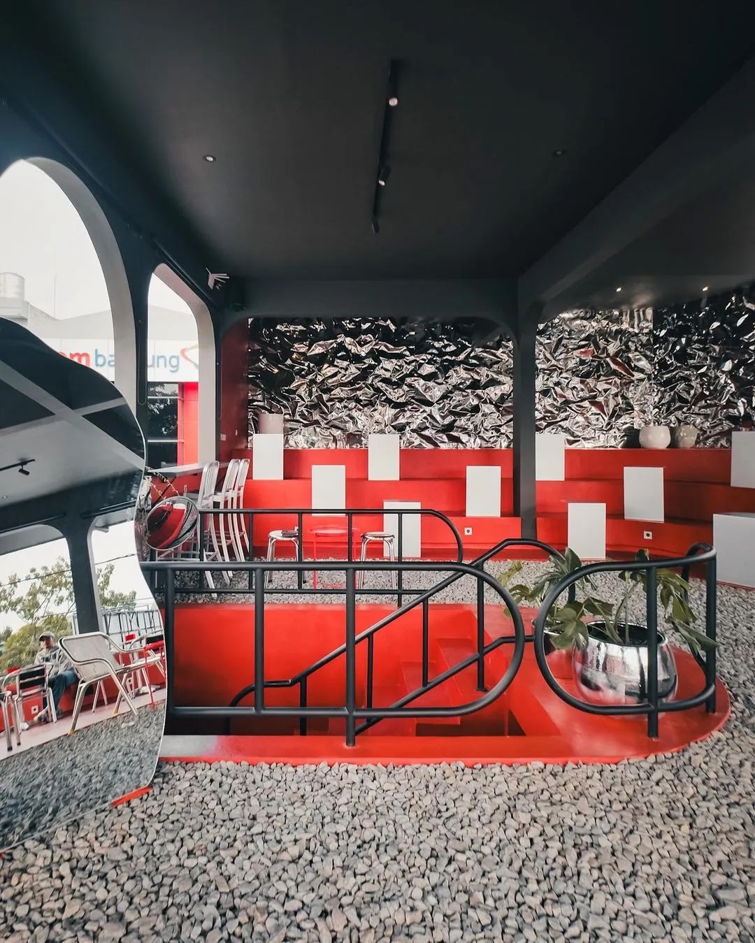 Desain bangunan tempat nongkrong hits di Bandung ini mengusung konsep minimalis modern berlantai 2 dengan dominasi warna merah menciptakan suasana estetik dan sangat instagramable.
